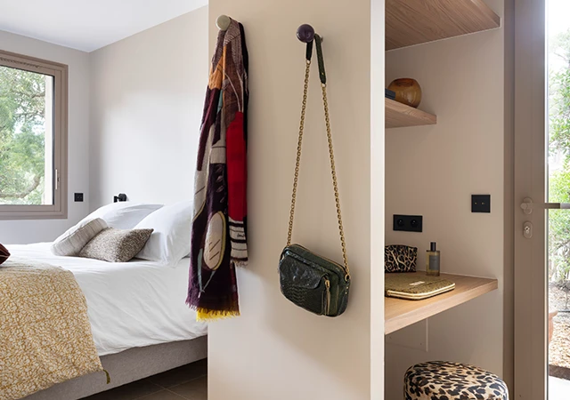 La quatrième chambre de la villa est un véritable cocon de sérénité, conçu pour ceux qui recherchent une connexion totale avec l’extérieur. Grâce à sa baie vitrée à galandage, l’espace s’efface pour offrir un accès direct et de plain-pied à la piscine. Cette prouesse architecturale permet de transformer la suite en une extension naturelle de la terrasse, baignée de lumière et de soleil.